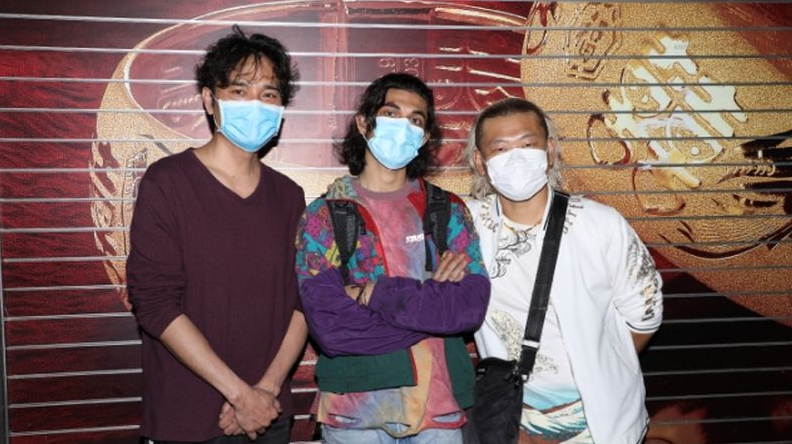 也确实如林家栋所言一样,在另一张照片中,想来也是当前没有拍摄的工作、不需要面对镜头吧,林家栋与两位友人一起合影时也是戴上了口罩做防疫。