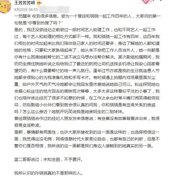 今年孙骁骁好像流年不利,最近又因为杨璐在某真人秀节目说当助理被某女星虐待,结果很快矛头指向了孙骁骁。娱乐圈有很多这种套路炒作和永远不给真相的冤案,杨璐肯定不会指名道姓,而孙骁骁一旦被质疑就有口莫辩,除非杨璐愿意出来为她证明清白,所以孙骁骁回应也罢,助理回应也好,只能说不默认,但没啥说服力。不过个人觉得孙骁骁不至于,一来她根本不红啊,哪有资格那么拽;二来小姑娘看起来还算善良温柔,不像那么丑恶的人;三来杨璐还是大胡子纯爷们,居然甘愿这样被凌辱?这也太没尊严了。那么你认为真相是怎样的呢?