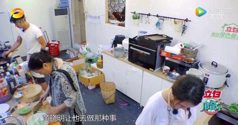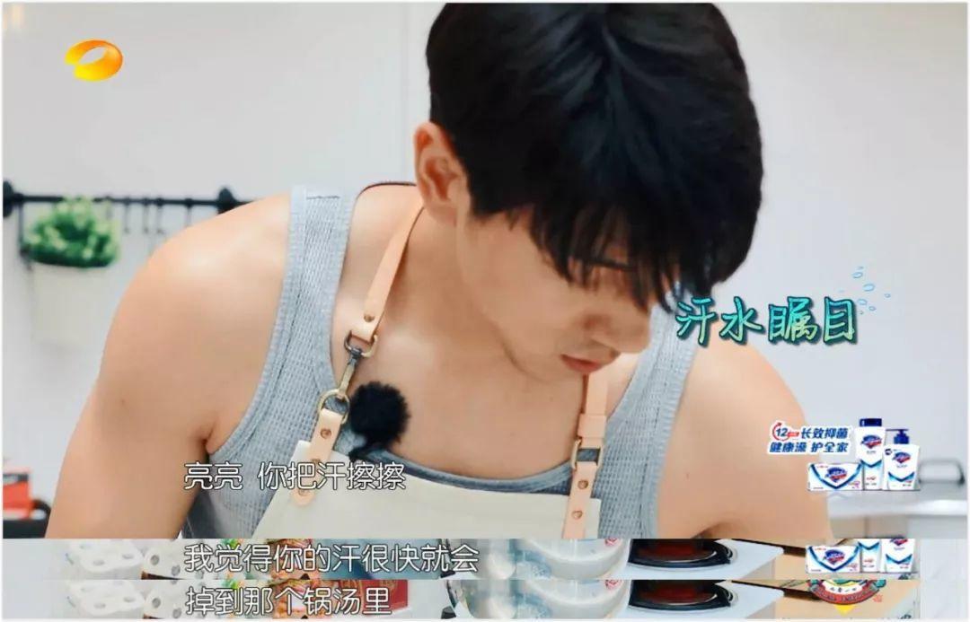 张亮在做饭,赵薇眼看他满头的汗就要滴进锅里不卫生。