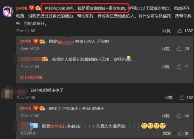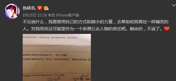 在8月25日深夜,热依扎还晒出了去医院看抑郁症的诊断书,可以清晰的看到上面确实有医生的签名,并且诊断结果上面写着:目前为重度抑郁发作,并有自杀风险。谁能料想到一个在人前如此阳光的女孩子,也会有如此痛苦的一面。能够将自己的亲身经历分享给大家,真的是人美心善了。