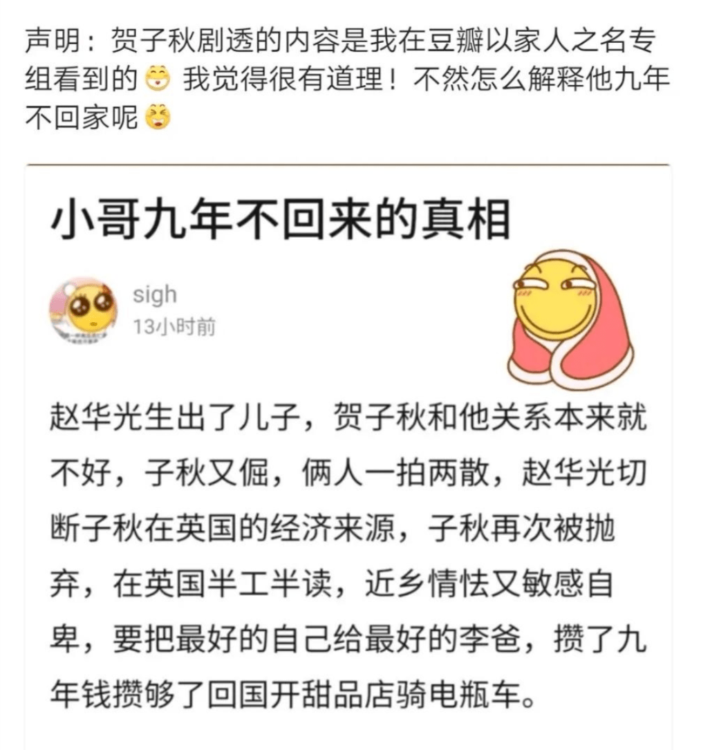 各种细节来看,加上网友的分析爆料,目前最有可能的剧情发展是,贺子秋到了英国后,后面赵华光又与妻子生了孩子,女方的打压反对,赵华光只能忽视贺子秋,不再资助他在英国的留学开销及生活支出,而贺子秋只能一边打工一边苦读着。所以之前贺子秋和李尖尖视频时,每次背景都是在公园。