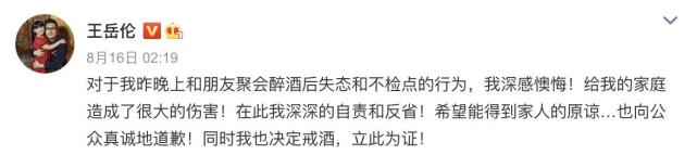 最终王岳伦只能发文道歉,承认自己酒后失态,行为不检点,深感懊悔,给家人造成很大的伤害,所以他决定戒酒,希望得到家人的原谅。
