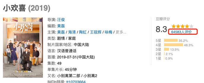 近日讨论度一天比一天高的《小欢喜》,虽然取得了8.3的高分,但是参与评分的人数连7万都不到;
