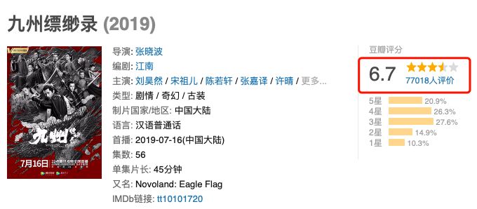 《九州缥缈录》不仅口碑没有爆棚,评分只有6.7,评价人数也只在7万到8万之间。