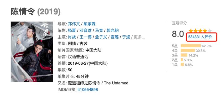 如今距离电视剧完结已有一段时间,比起在海外走红,更出乎意料的是《陈情令》的评分,本来就一路逆袭的口碑,近日还在上涨,目前稳定在8.0分上下,打分人数高达53万。