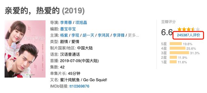 而今年夏天的另一部爆款《亲爱的,热爱的》,评分只有6.6,打分人数甚至连《陈情令》的一半都不到,在24万左右。