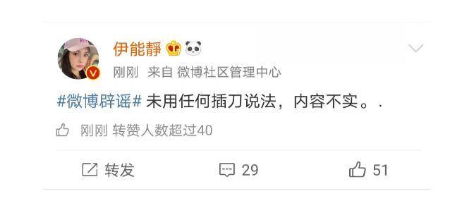 爆料出来以后,伊能静又迅速辟谣,说自己没有采用任何插刀的说话,内容不实。但是随后,大家又发现伊能静秒删了,如今找不到这条微博了。