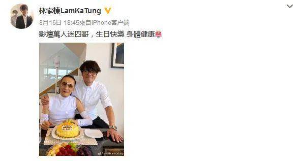 林家栋配文:“影坛万人迷四哥,生日快乐!身体健康!”据悉,林家栋在去年曾邀请四哥拍摄其监制的新片《杀出个黄昏》,两人应该是从那时开始成为好友。