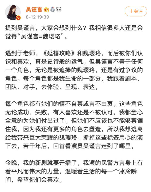 而吴谨言在这部剧开播的时候还写了篇小作文,大致的意思是提到吴谨言就会想到魏璎珞,但是她想要打破桎梏,撕掉魏璎珞的标签,用心演下去,尝试不同风格的角色之类。本以为大家会因为这篇小作文而感动,殊不知最后都是被吐槽和嘲笑了。大家的确是因为魏璎珞认识了吴谨言,但也可以说是戏红人不红吧,吴谨言的演技一直都没有被认可,包括魏璎珞。