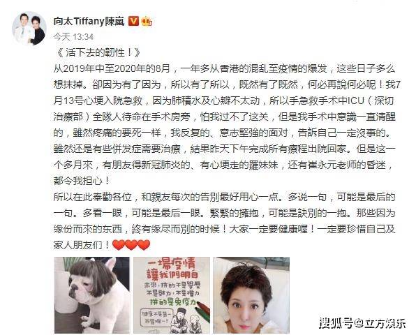 8月17日,向太陈岚在个人账号晒出一组九宫格报平安,宣告自己刚结束为期一个月的心梗治疗顺利回家。这一个月内发生了很多事,向太在感慨好友罗霈颖命运的同时,也希望每个人都能珍惜眼前人。不得不说,向太一直非常正能量,不过这次的经历还是蛮惊险的。