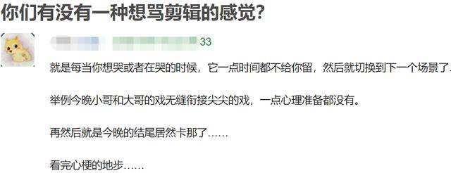 有人吐槽表示每次想哭或者正在哭的时候,剪辑一点时间都不给留,就切换到下一场景了。