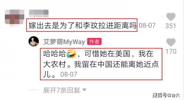 在视频下方的评论区里,有网友认为她远嫁海外是为了和李玟拉近距离,艾梦萌则回复称自己在大农村,而李玟则在美国,还不忘自嘲如果留在国内,还能离李玟近一点。