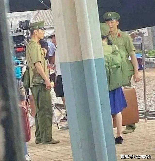 从路透照来看,肖战身穿一件老式绿色军服,戴着一顶陆军大沿帽,背着挎包和水壶,微微有些驼背,正认真看着黄景瑜和女演员对戏。