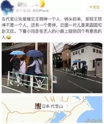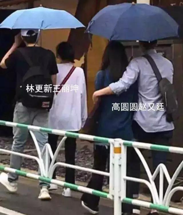2018年9月,有网友发文称在日本偶遇王丽坤和林更新同游,后面还跟着高圆圆赵又廷这一对儿。照片中,林更新王丽坤同撑一把伞走在前面,后面一对则更加亲密,赵又廷将高圆圆搂在怀里。