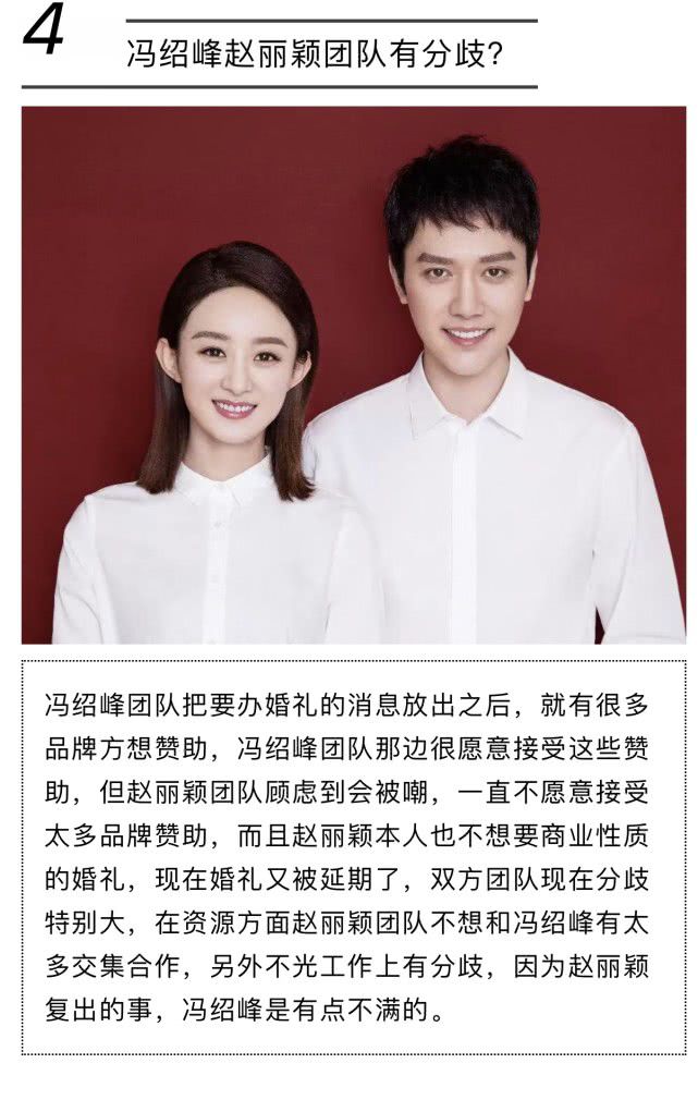 这名娱记称两人的团队因为婚礼是否接受赞助以及演艺资源的划分上分歧严重,进而婚礼延期,不仅如此,这名娱记还称赵丽颖复工引得冯绍峰不满。娱记表示,冯绍峰希望赵丽颖在家当全职太太,但是赵丽颖不愿,夫妻两人并没有达成共识。