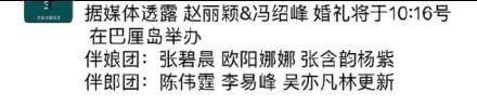 就在赵丽颖正式亮相前还传出了其与老公冯绍峰将补办婚礼的消息,有消息称赵丽颖夫妻将于10月16日在巴厘岛举办婚礼,甚至连伴郎伴娘团的名单都在网上流传。