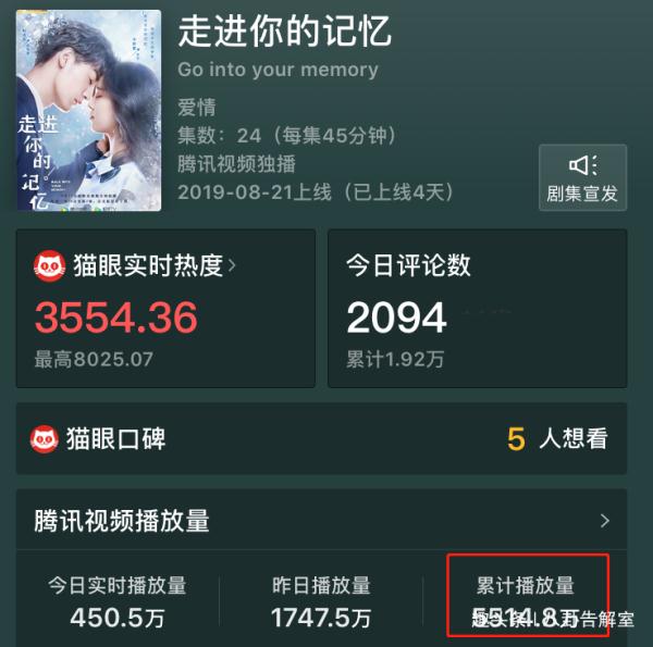 也许是两人演绎很不错,加上剧情不拖沓,反而是节奏很紧凑,导致这部剧才播4天就开始逆袭了,短短4天播放量就破五千万了,看来这部剧的确是良心好剧。按照现在这部剧播放量还在提升的趋势,这部剧想必最后播出后,一定会成为黑马剧。