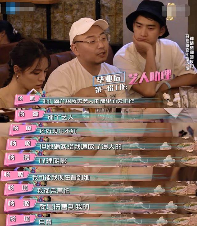 杨璐在节目中感慨幸好自己之前跟的艺人不红,他表示自己的专业学的是表演,毕业后因为有很多经纪人朋友,就被介绍到某个艺人那去工作,有了第一份工作艺人助理,但就是这个艺人带给了他极大的心理阴影,现在看到该艺人依旧会害怕,因为在工作期间那个艺人不断的伤害了他的自尊。