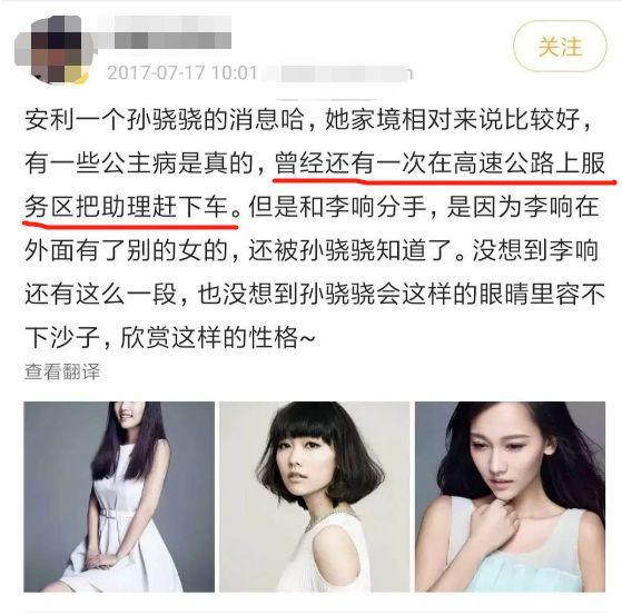 之后,还有网友找到一条17年孙骁骁因为和李响分手曾经在高速公路把助理赶下车的消息,和杨璐所说又对上一条。