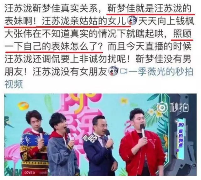 但之前也曾传出过,两人是表兄妹的关系,称靳梦佳是汪苏泷亲姑姑的女儿,所以,钱枫在节目中提到的照顾一下也就能理解了?