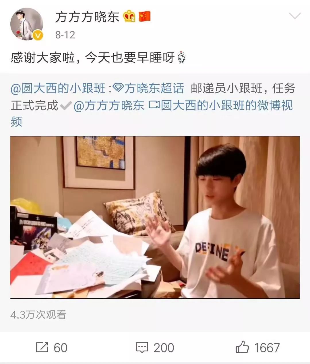 会认认真真看完粉丝每一封信的方晓东,还专门录制视频表达对粉丝的感谢。