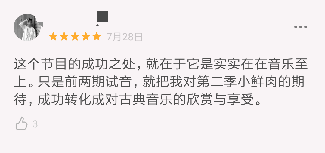 不管是第一季还是第二季,这位豆瓣网友一语道破节目核心:实实在在的音乐至上。两期试音下来,就把对第二季小鲜肉的期待,成功转化成为对古典音乐的欣赏与享受。